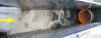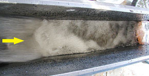 Innerhalb 30 Sekunden wurden bei diesem Testfilter (siehe Bilder) 3,5 kg Sand-Kiesgemisch mit Hilfe des Wechselsprunges fortgespült.